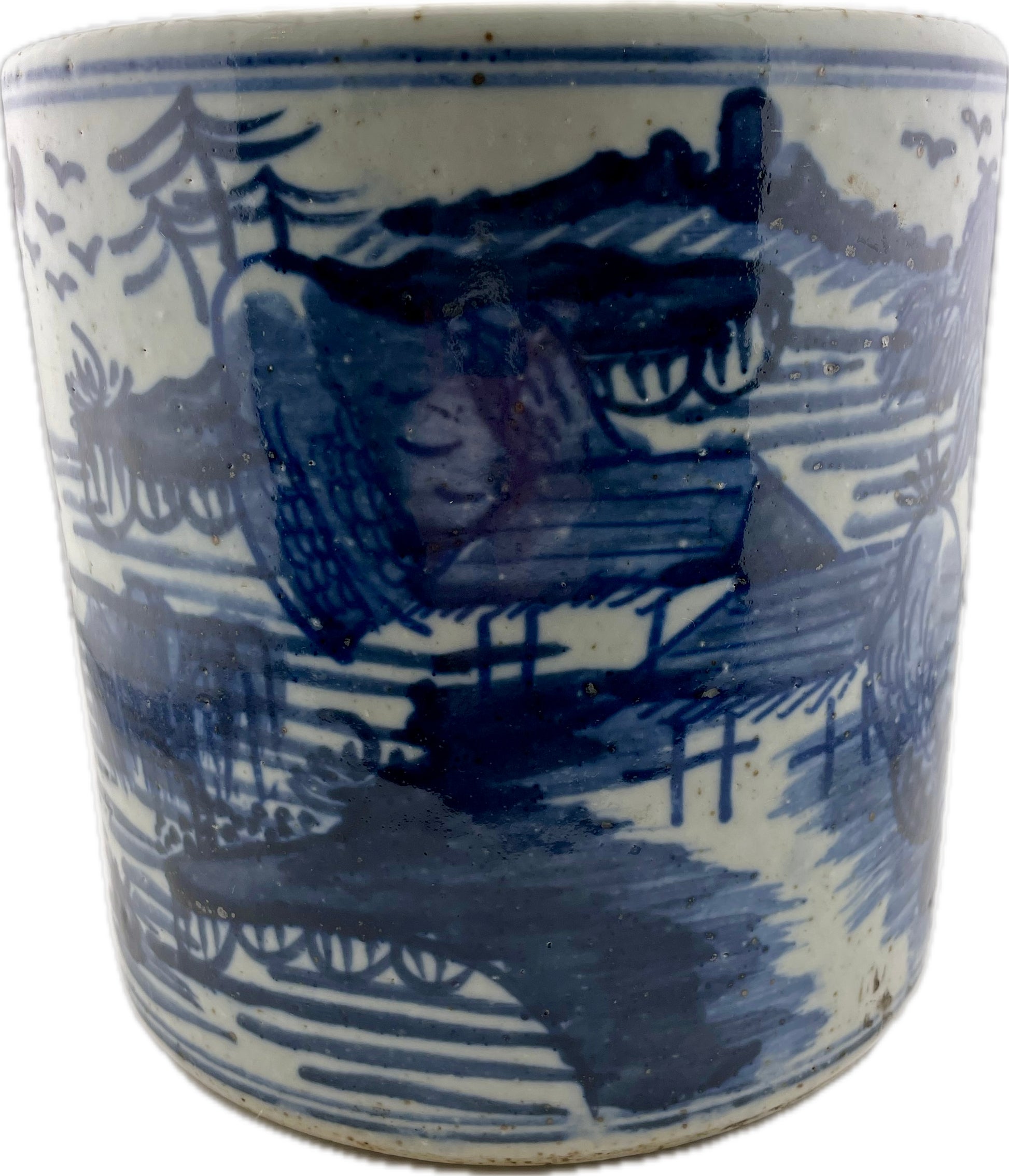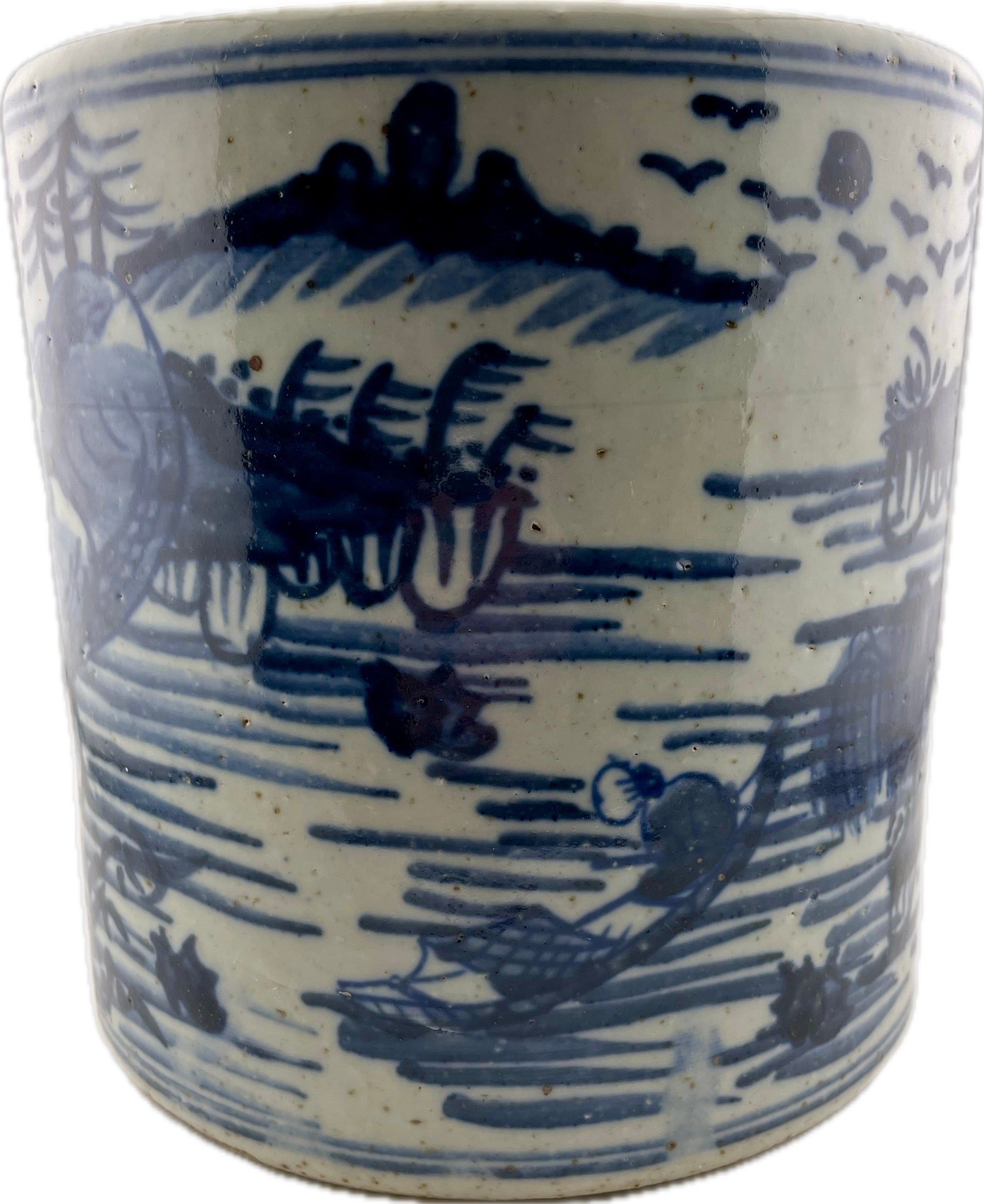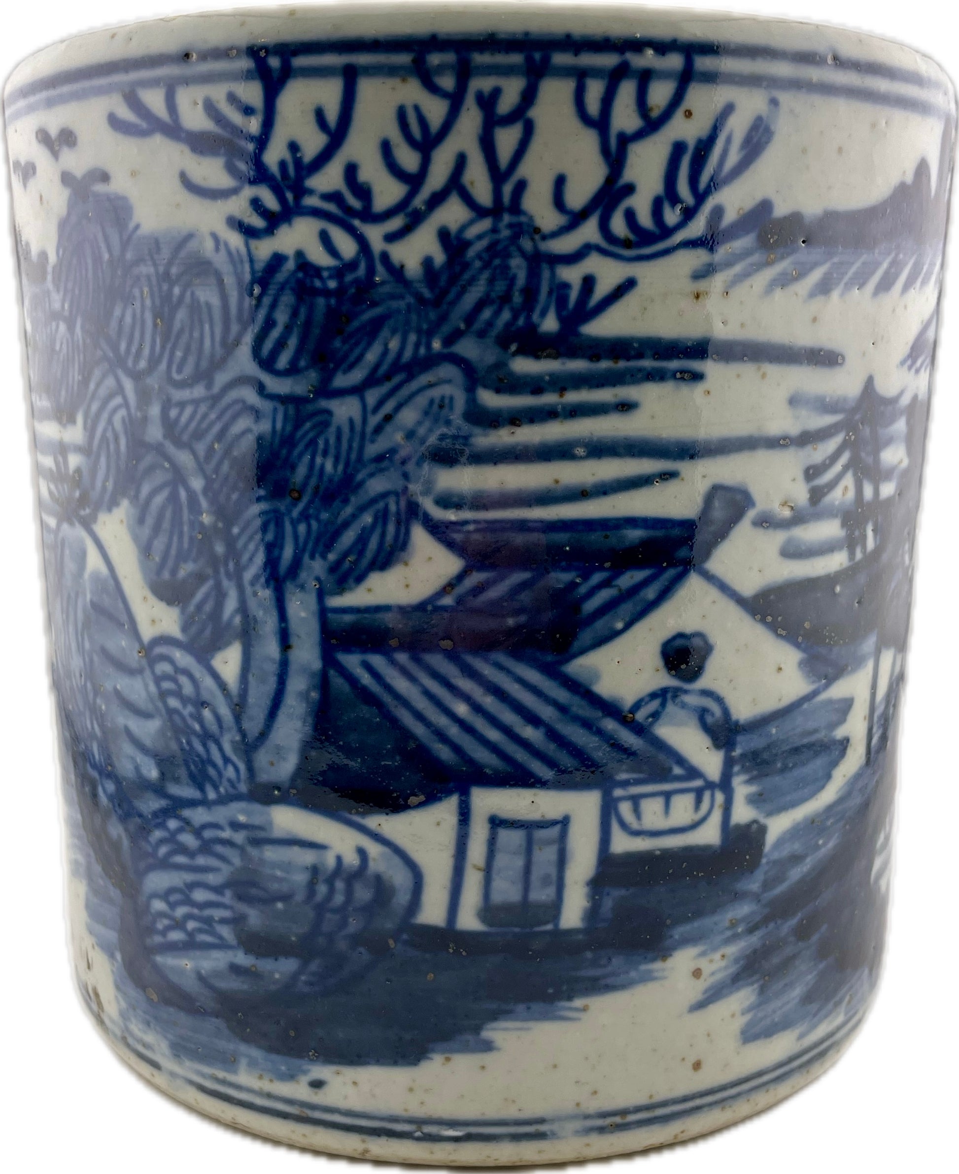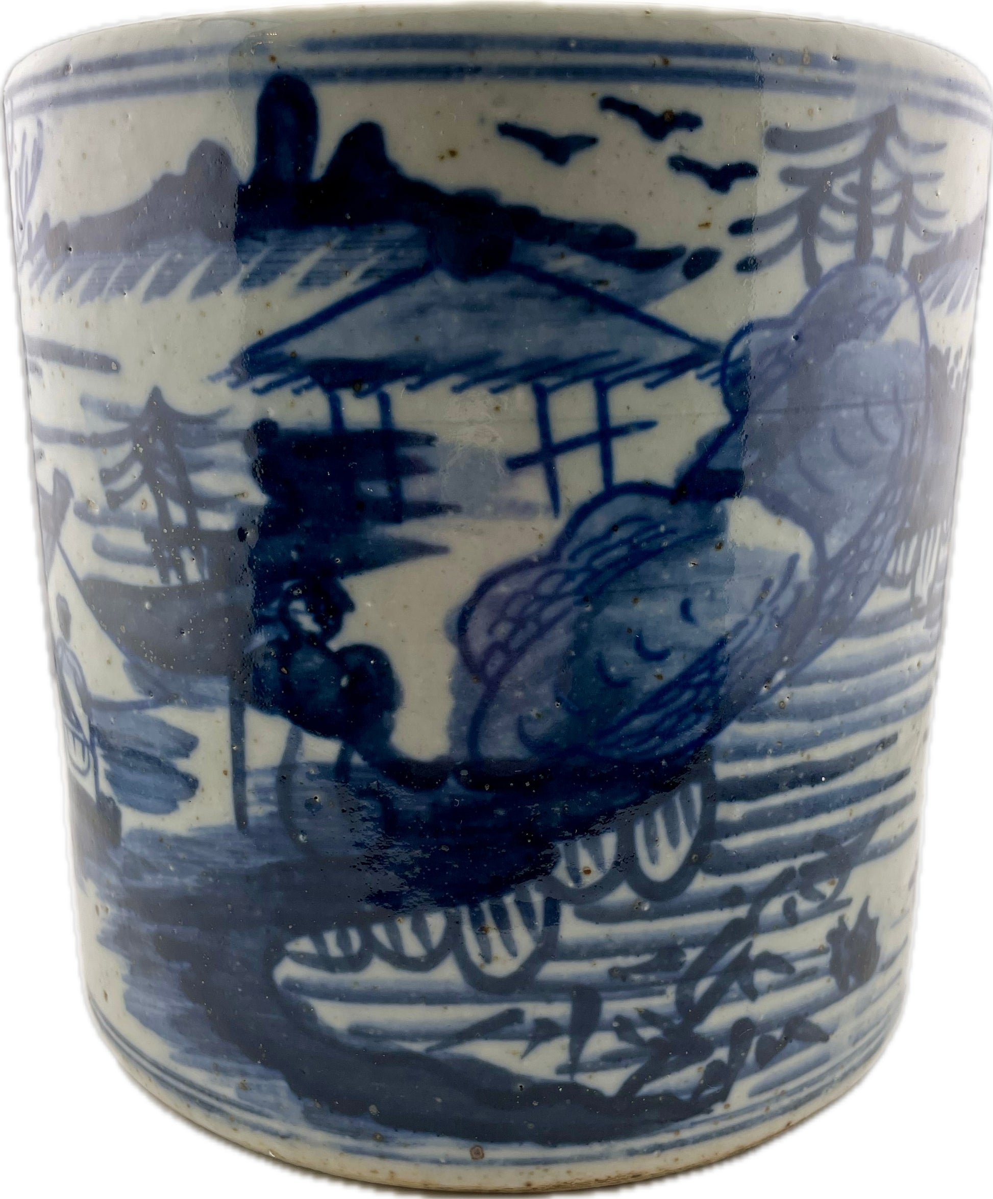 Our blue and white Canton design reproduction planter is made with foot stomped clay and has a more rustic finish. Planter is a cachepot and has no drainage hole.