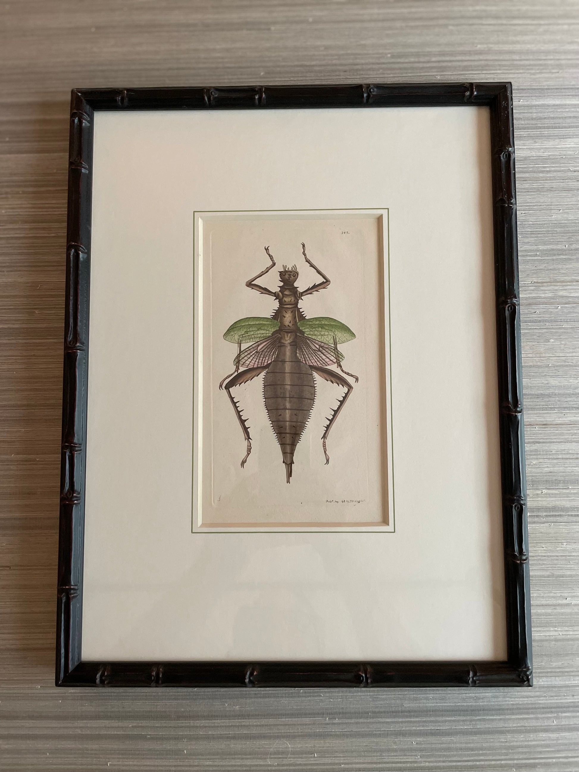 Pair of dilated phasmid (leaf insect) original hand colored engravings from George Shaw and Frederick Nodder’s The Naturalist’s Miscellany. Beautifully custom framed in a slightly distressed black faux bamboo molding and hand cut ecru mat with hand drawn green pencil line detail.