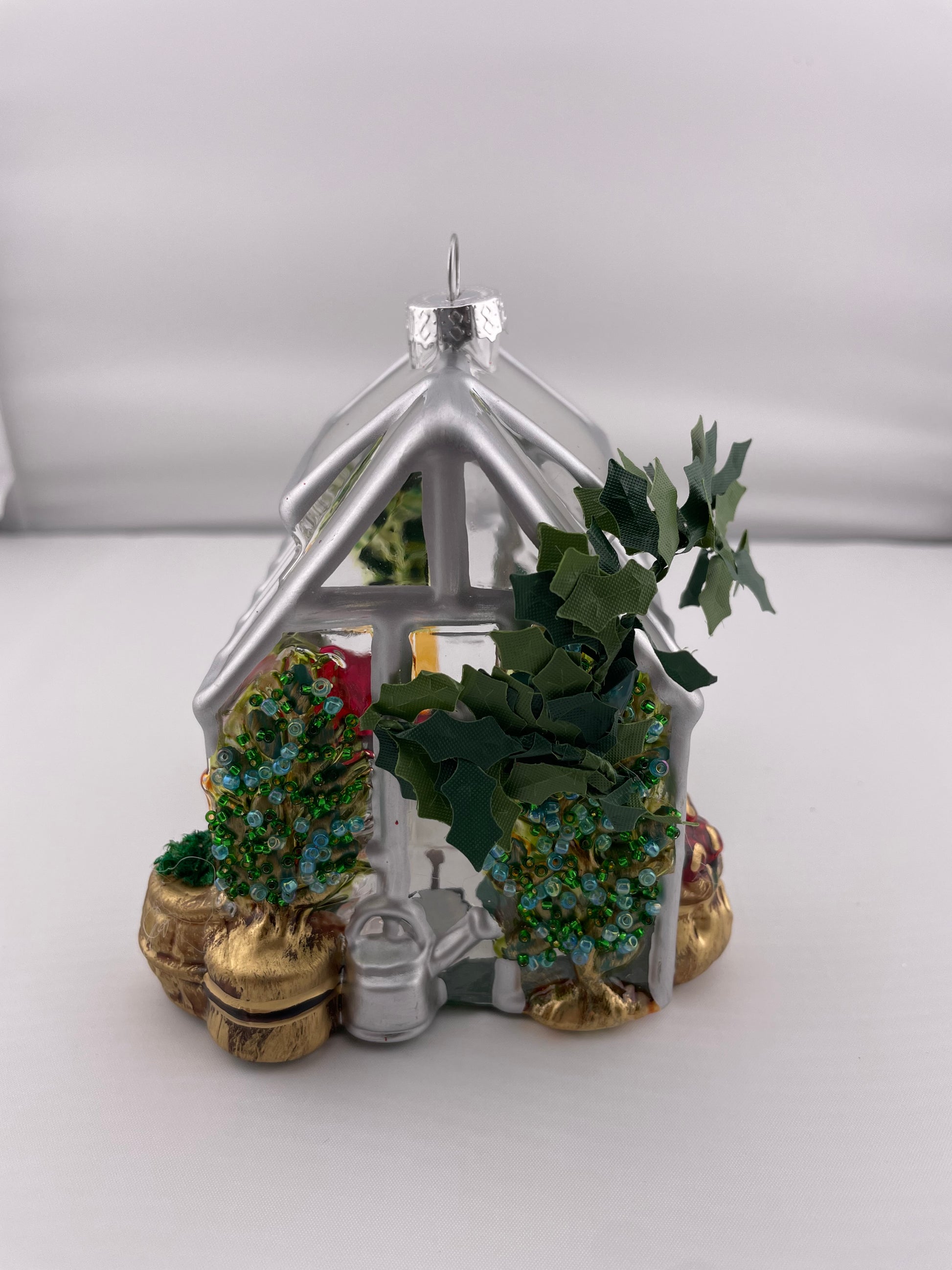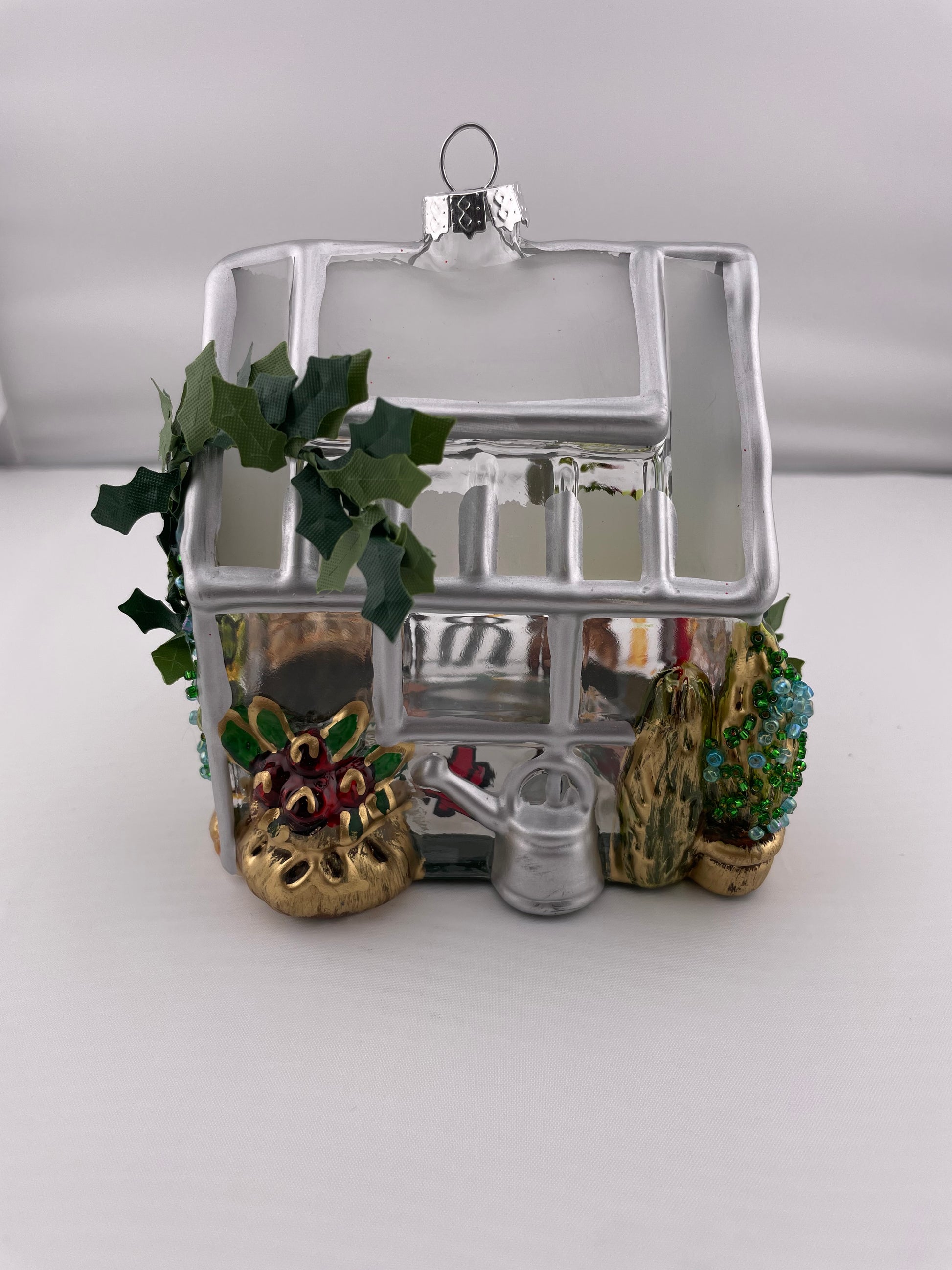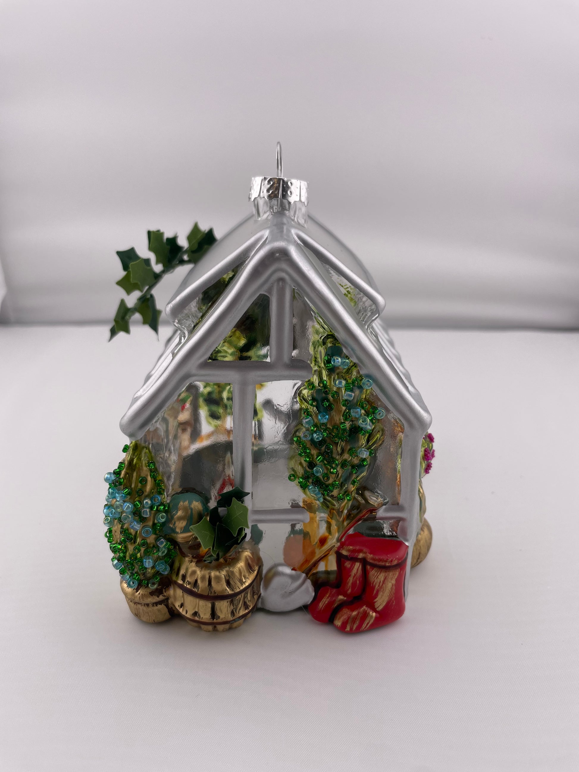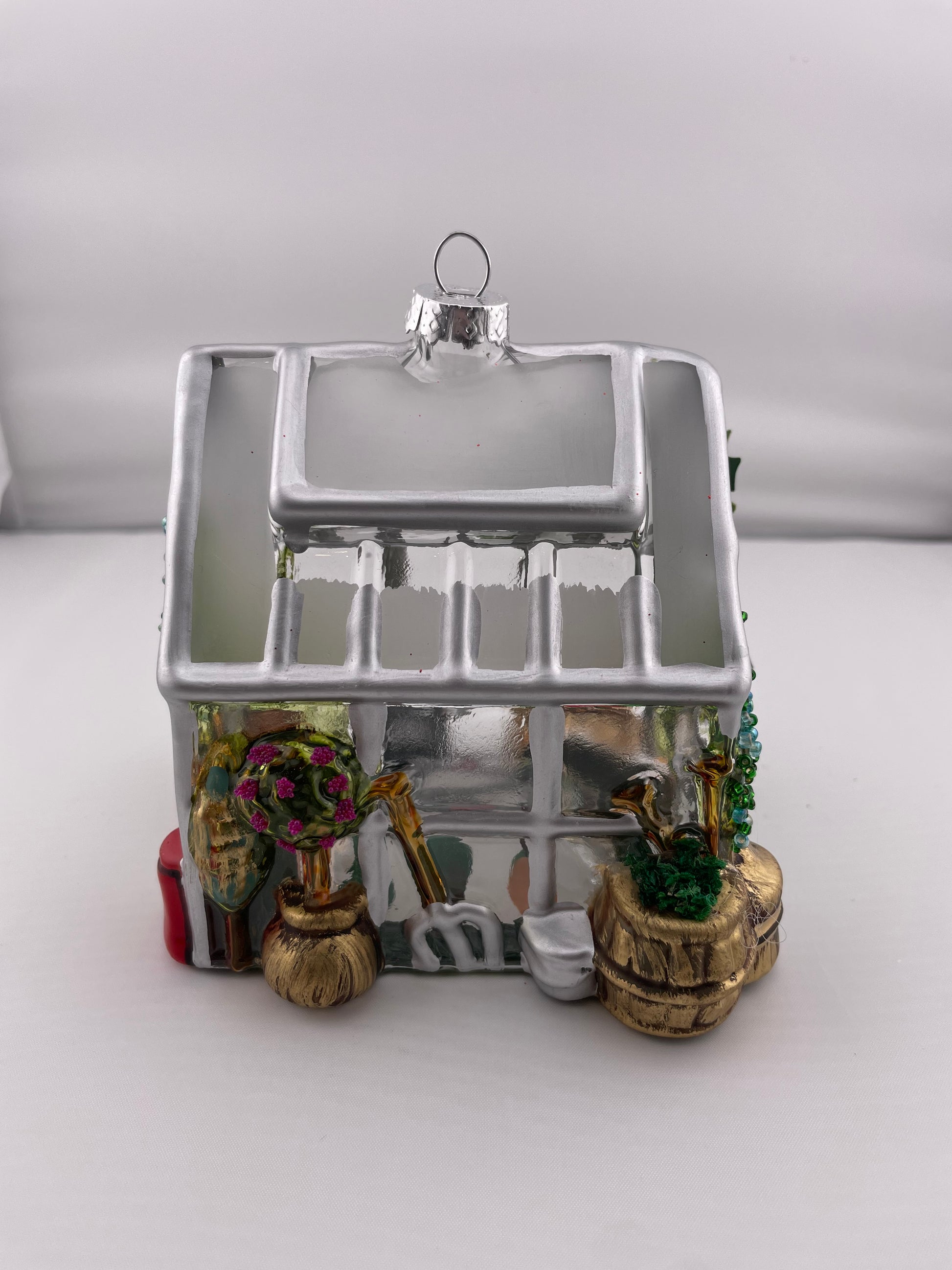 The glasshouse hand painted molded glass ornament features a matte silver painted house frame surrounded by multi dimensional garden tools, implements and "planted” containers. Colorful beads and faux moss add a bright and fun dimension to the container plants. A faux ivy vine adorns one end of the glasshouse.