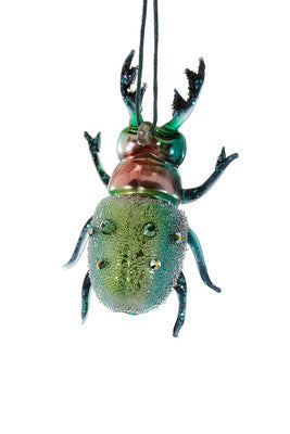Please don’t spray the bugs! The green stag horn beetle hand blown glass ornament has a green and yellow abdomen complemented with green faux jewels, a copper colored thorax and green glittered brown glass mandibles and legs.